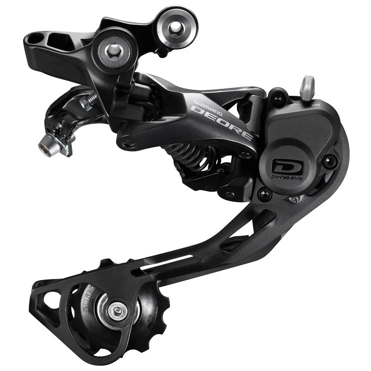 De Shimano Deore RD-M6000 achterderailleur is geoptimaliseerd voor Shimano’s “Dyna-Sys” technologie. Dankzij de Shadow RD+ technologie kan met een schakelaar op de achterderailleurkooi de veerafstand worden ingesteld, waardoor het springen van de ketting wordt voorkomen.