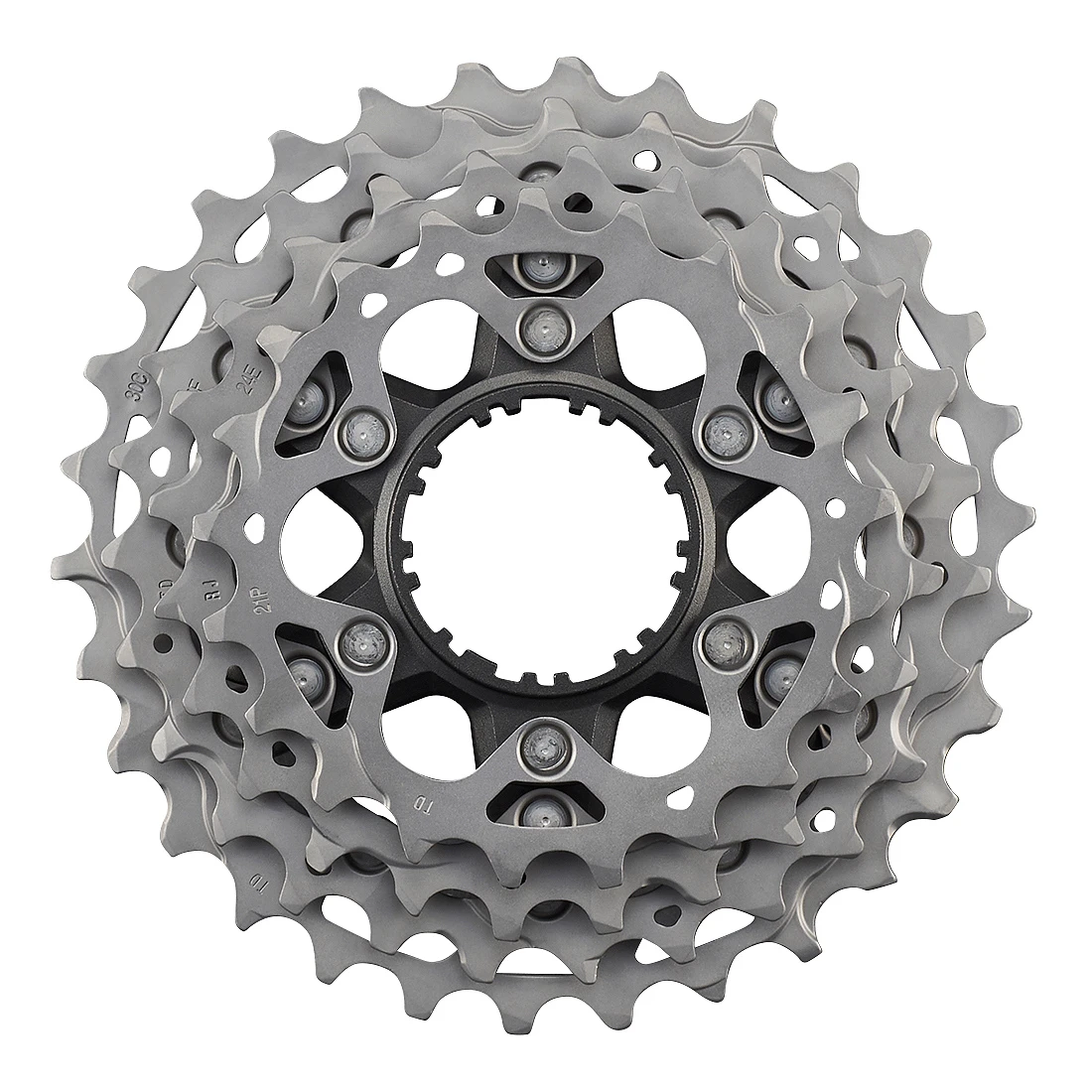 Pinion unit for the Shimano Dura Ace CS-R9200 road bike cassette with a gradation of teeth. The 5 sprockets are made of titanium, the spider consists of anodised aluminium.