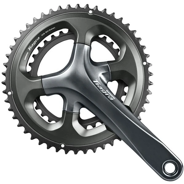 crank met twee versnellingen voor 10-speed aandrijfsystemen van de Shimano Tiagra 4700 groep met geïntegreerde lageras. In het onmiskenbare Shimano-design zonder crankkap met glanzend grijze afwerking en geanodiseerde kettingbladen. Tweedelige combinatie van cranks en trapas. Verkrijgbaar met verschillende crankarmlengtes en kettingbladposities.